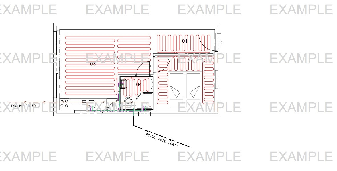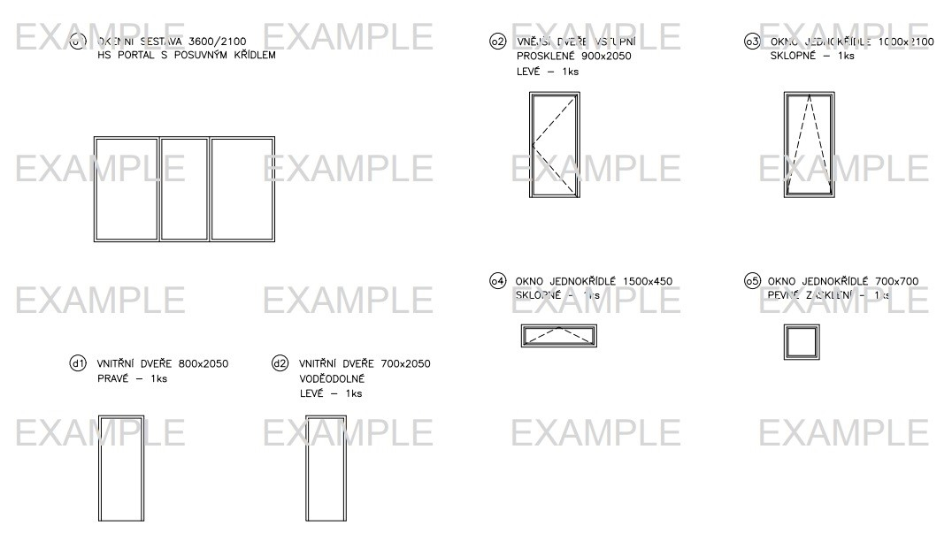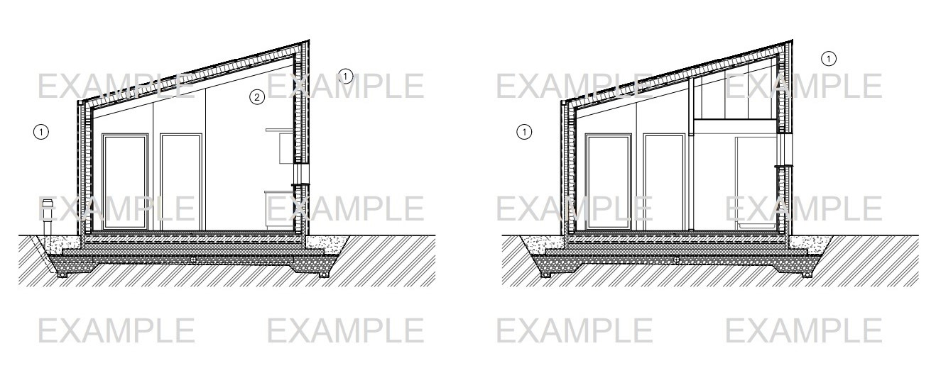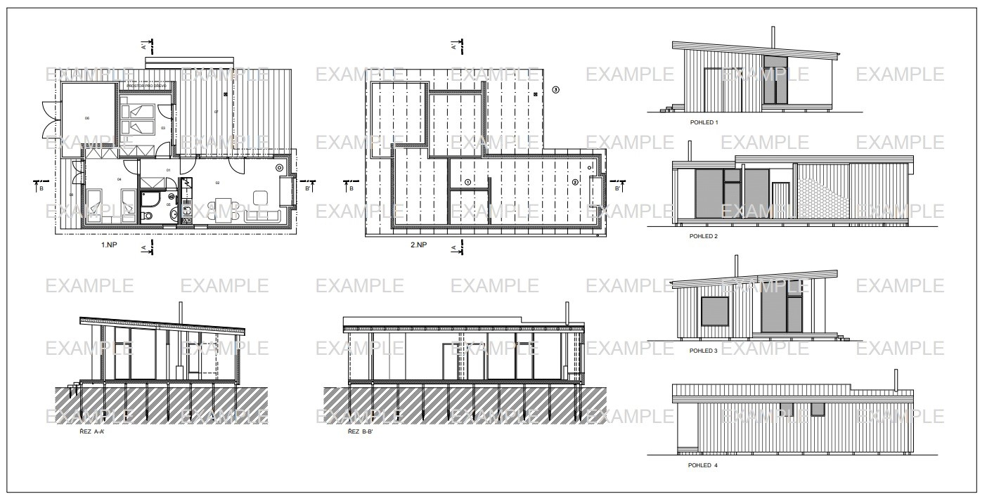 A brief technical report (which includes a description of the construction design), drawing of the building's location on the building plot, floor plans, detailed cross-sections drawings with elevations A-A, B-B, side views, drawings of the truss and roof, drawings of electrical, plumbing, and heating technology (electric floor heating), product listing (window system and interior doors). Delivery in PDF by email within 3 – 5 working days.